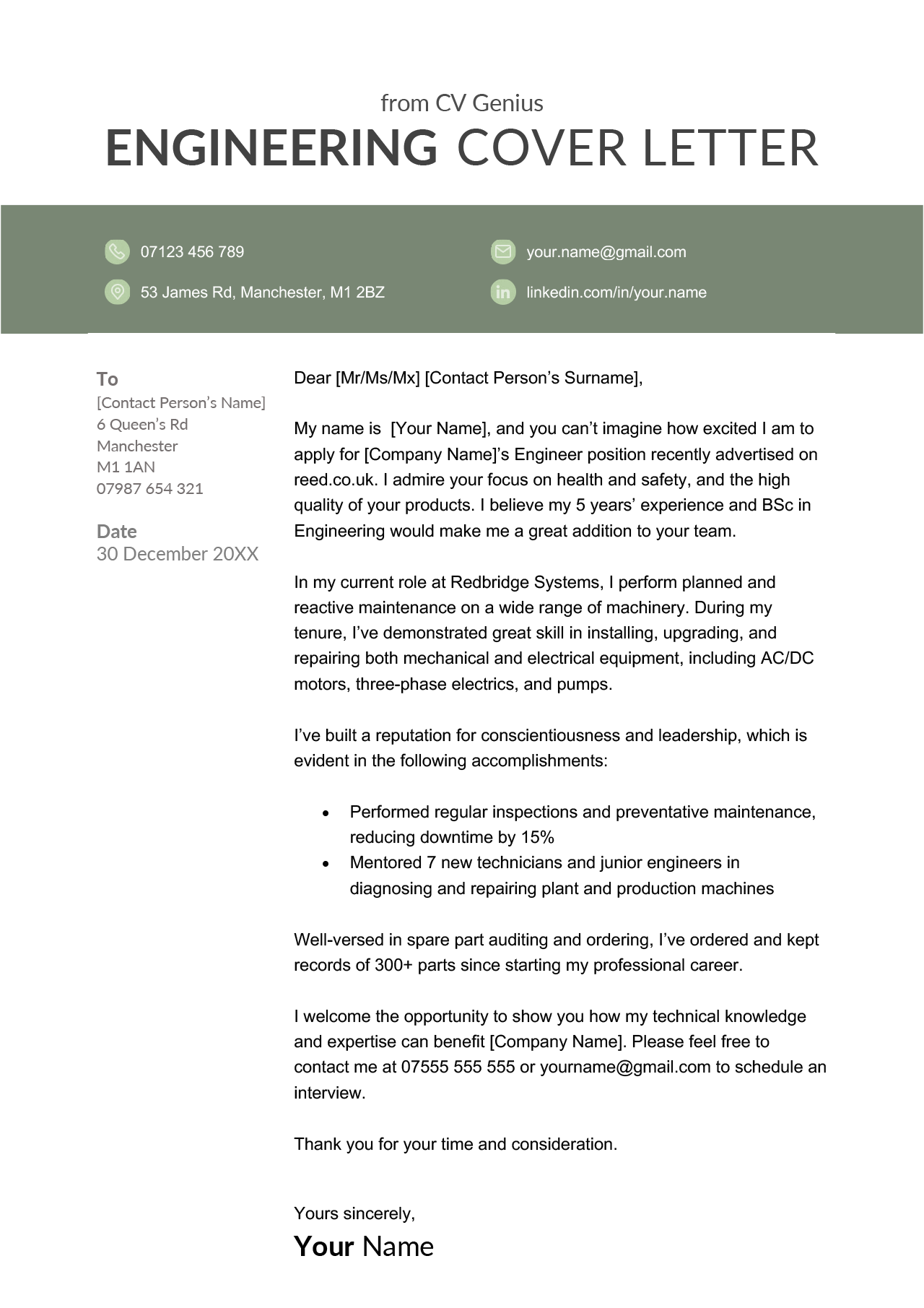 My name is (Your Name), and you can’t imagine how excited I am to apply for (Company Name)’s Engineer position recently advertised on reed.co.uk. I admire your focus on health and safety, and the high quality of your products. I believe my 5 years’ experience and BSc in Engineering would make me a great addition to your team.