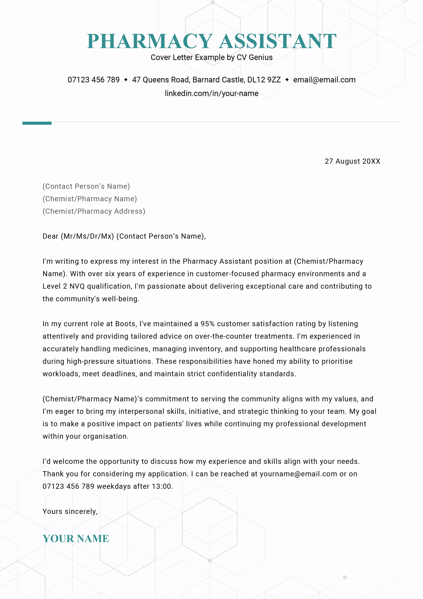While your pharmacy assistant CV outlines your experience, your cover letter shows why you’re specifically suited to the role you’re applying for.