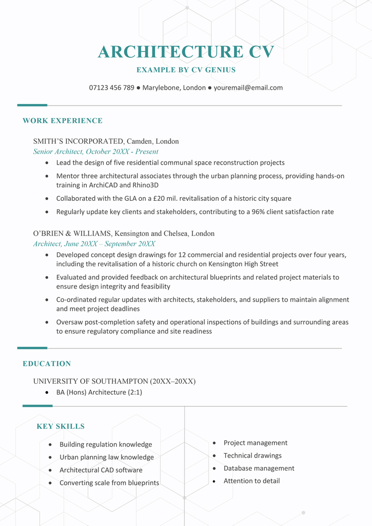 If you include several of these key hard and soft skills, you’ll be sure to impress employers with your architecture CV.
