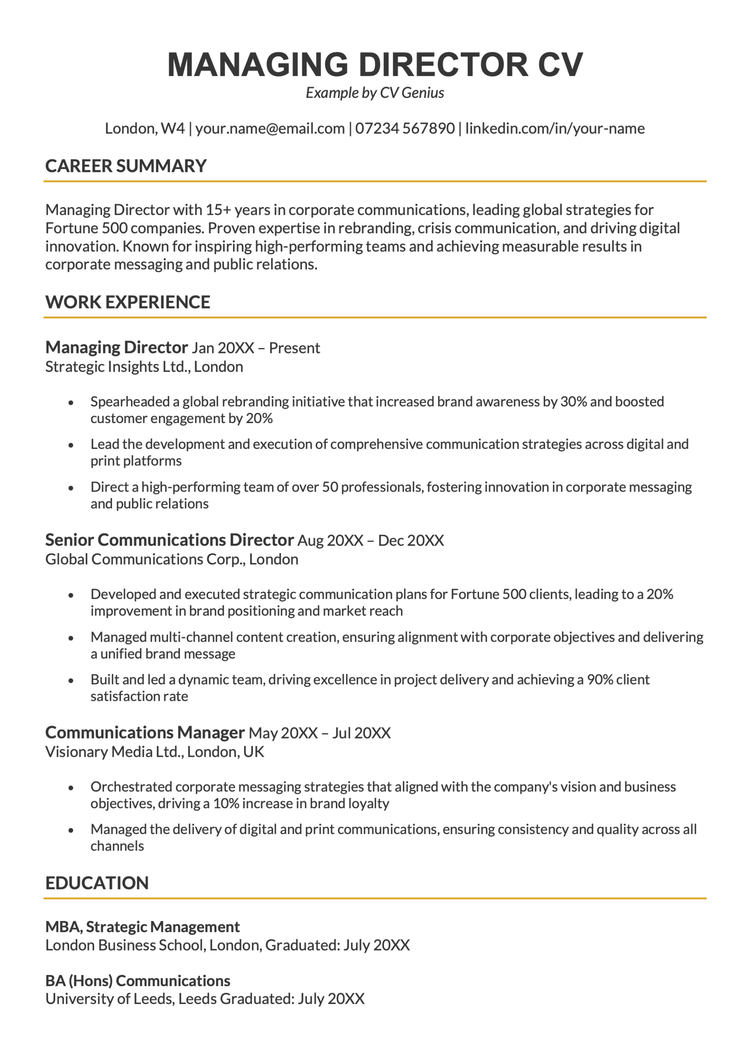 Where possible, the achievements of your experience section should be measured in hard numbers. The employer knows the influence that their next managing director will have on company performance, so their focus will be on the bottom line.