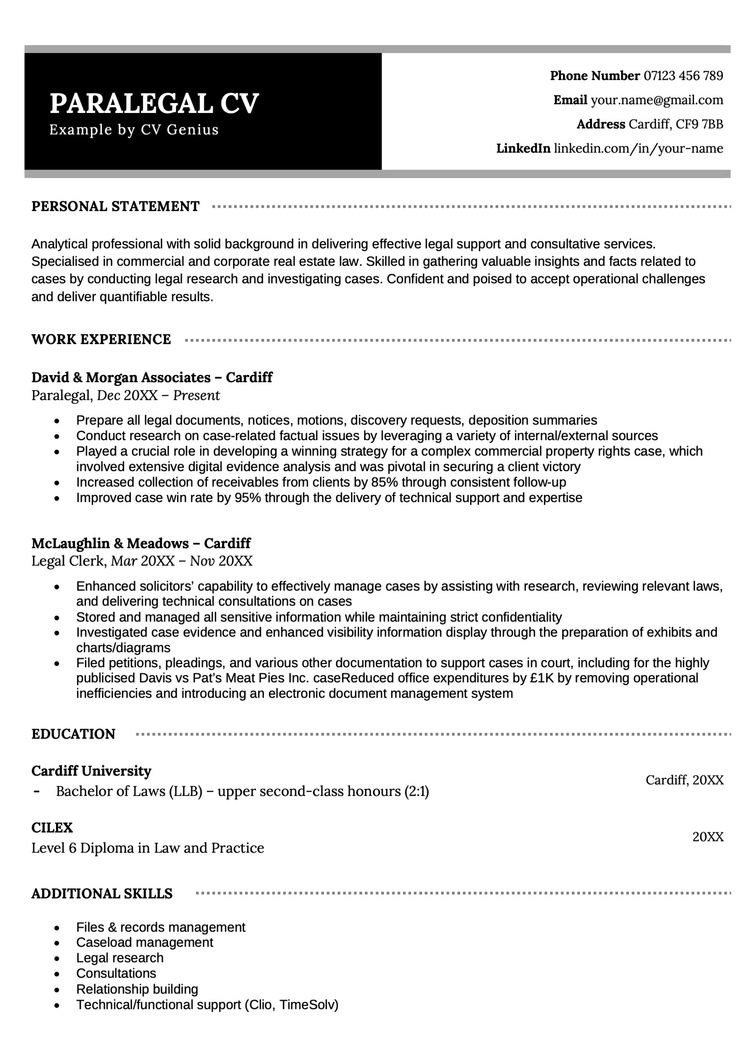 Here’s a paralegal CV example that illustrates how to present your paralegal skills in the professional experience section of your CV: