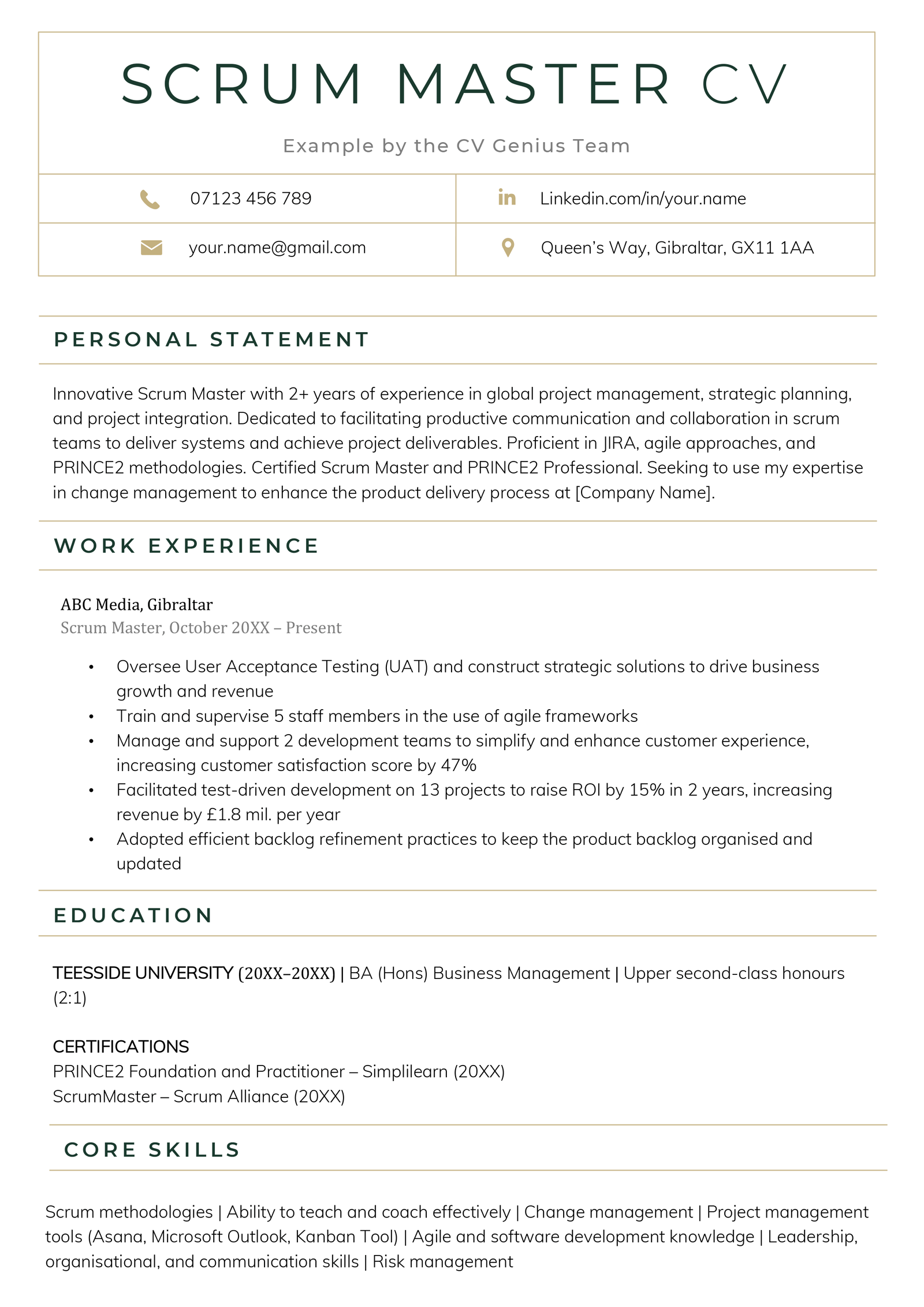 Also, note the skills-based keywords in the job posting and use them in your personal statement, fitting them in naturally while avoiding keyword stuffing. Including Scrum Master–related keywords and using a CV template made for the UK helps your application get past the applicant tracking systems (ATS) companies use to determine which candidates to review.
