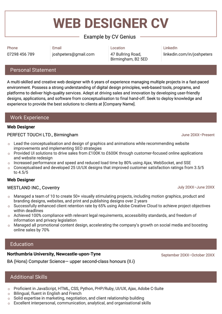 Web designers often work with diverse teams, making collaboration and problem-solving skills crucial. Use your CV to show how you’ve worked with developers, marketers, or stakeholders to deliver successful projects. Highlight your approach to solving design challenges, whether through user testing, iterative design processes, or data-driven decisions.