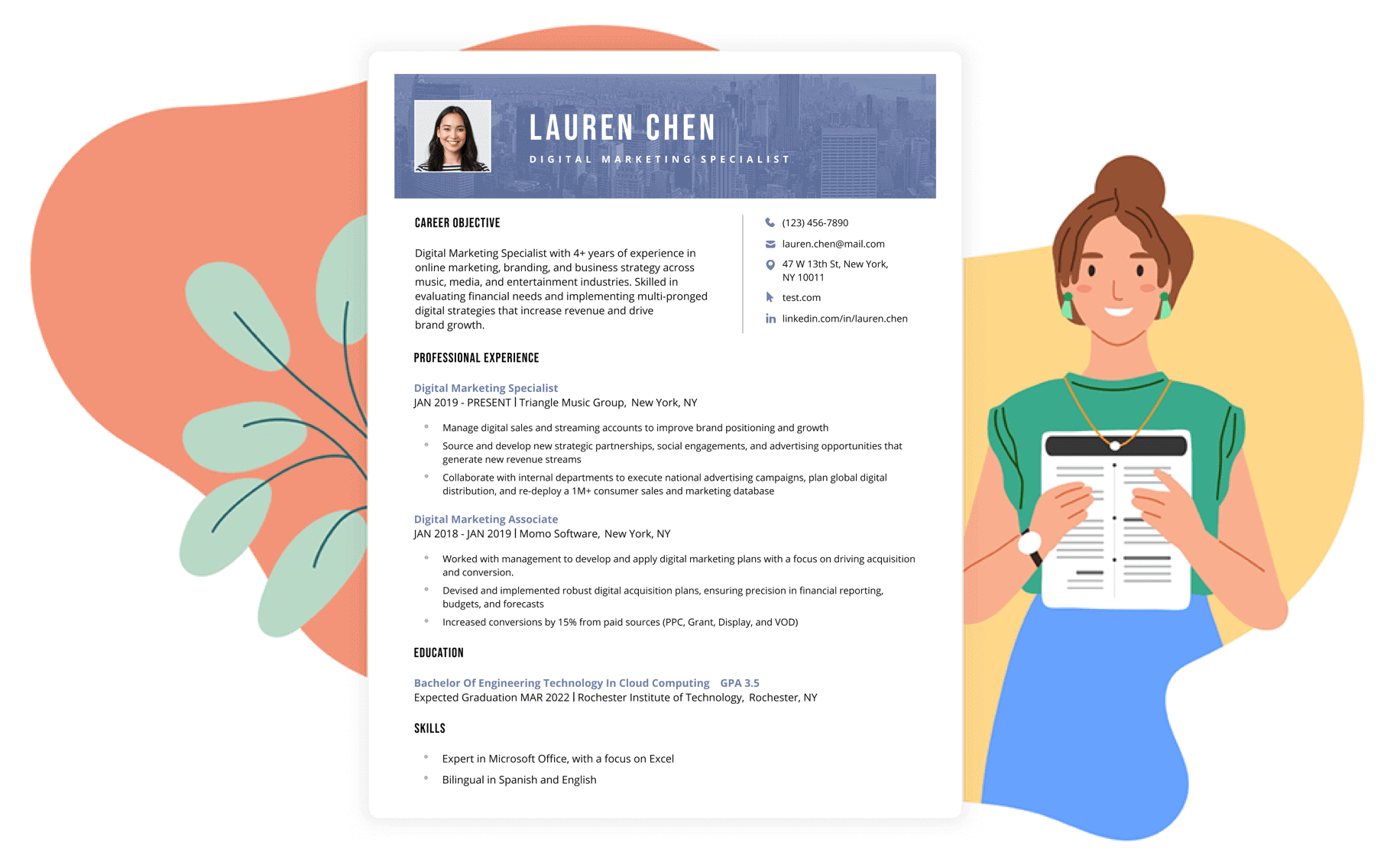 First, pick a template and colour. We've categorised them by style for your convenience: modern or traditional, casual or formal. Colourful templates work best in creative industries, while darker colours are better for traditional fields.