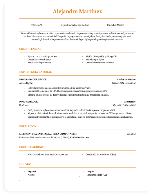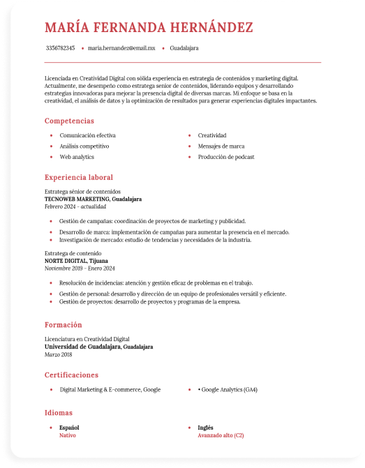 Escoge una de nuestras plantillas según tu profesión, sector y nivel de experiencia, y crea un currículum intachable en cuestión de minutos.