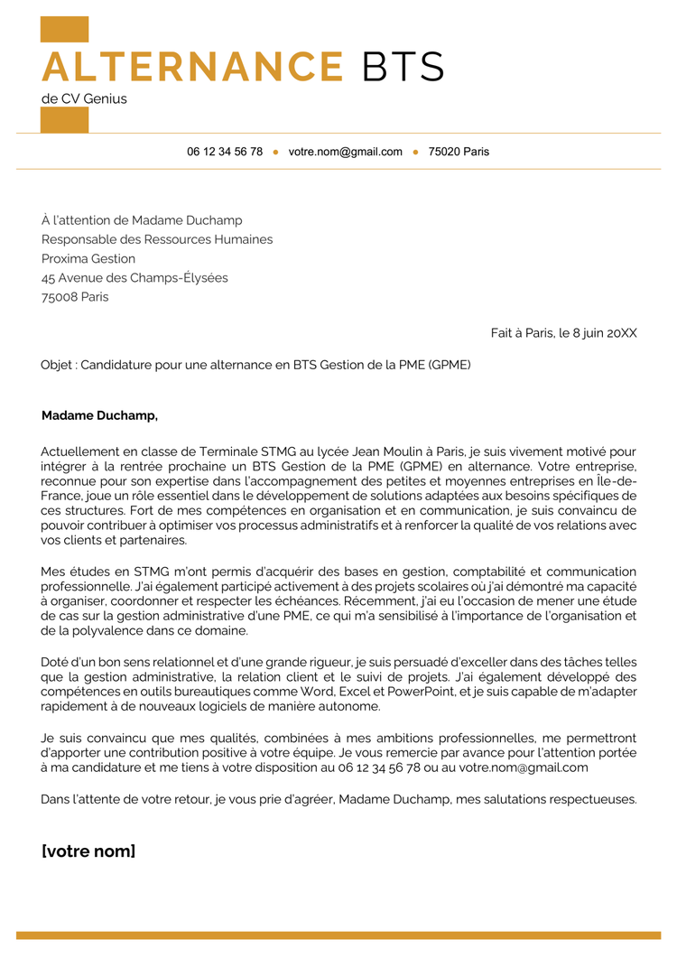 Lettre de motivation alternance BTS (format texte)