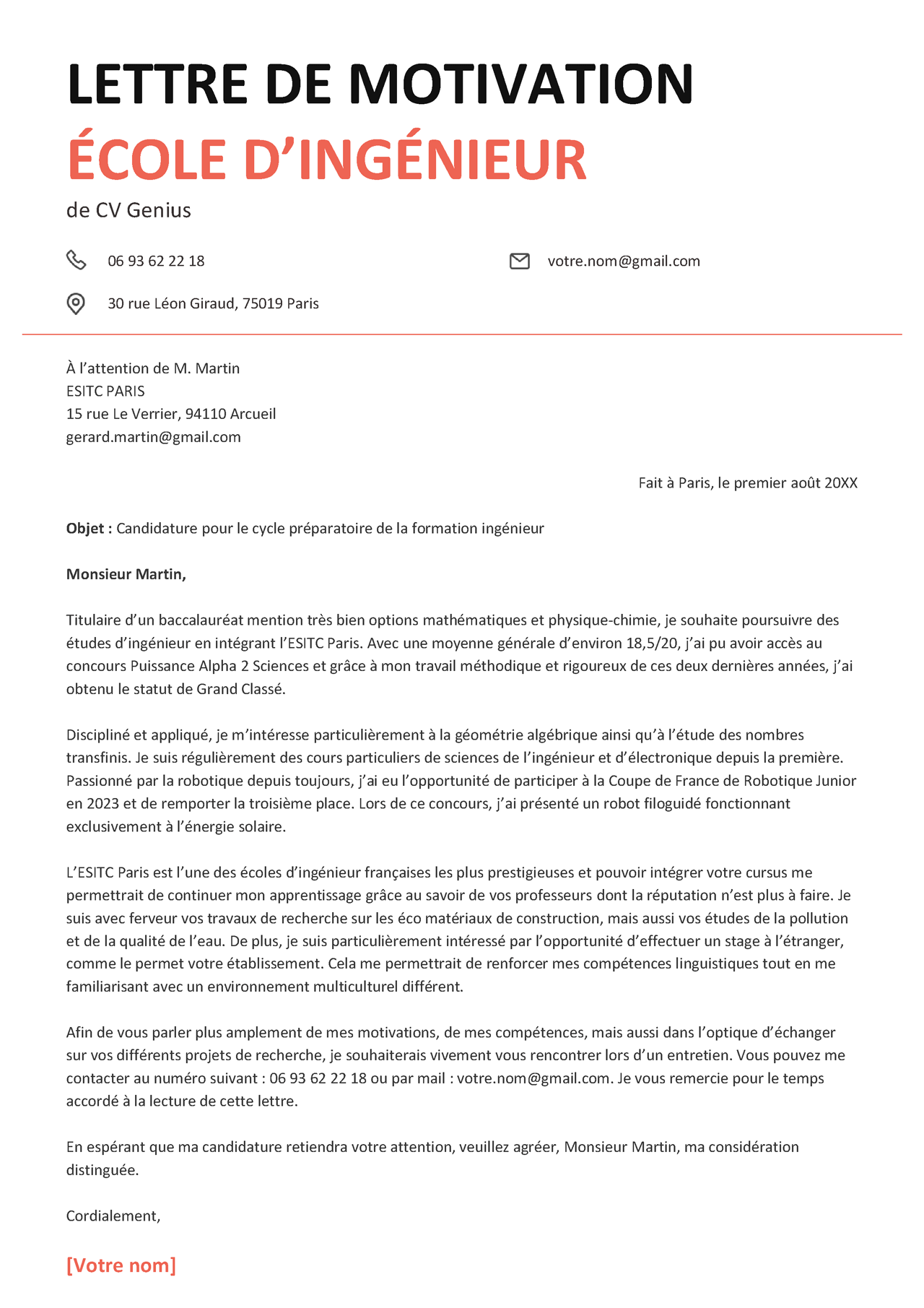 Lettre de motivation école d'ingénieur (format texte)