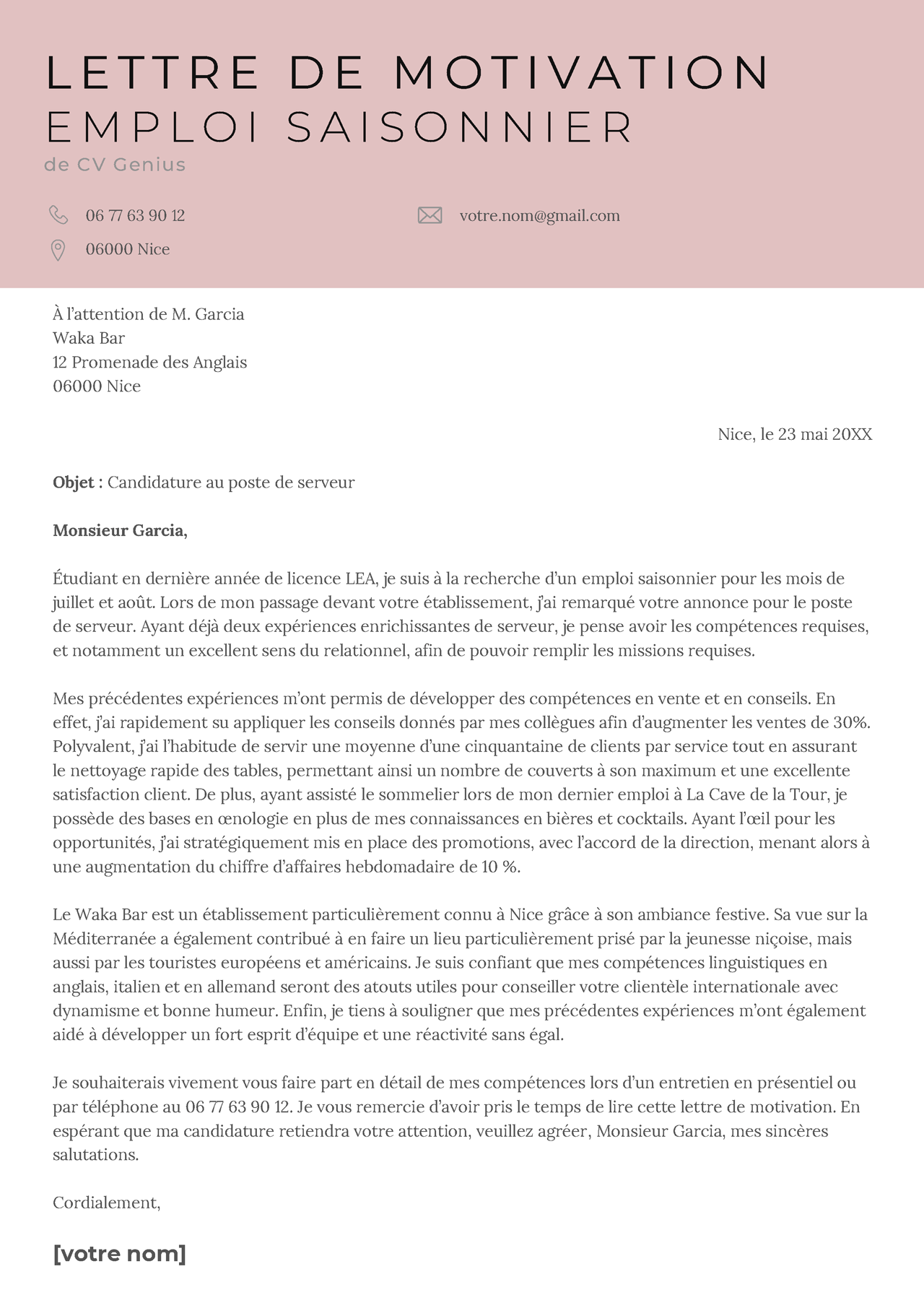 Le dernier paragraphe correspond à ce qu’on appelle un appel à l’action (ou call-to-action en anglais). Cette partie de votre lettre de motivation sert à réaffirmer votre intérêt pour le poste visé et votre souhait de rencontrer le recruteur lors d’un entretien. N’oubliez pas de redonner vos coordonnées pour faciliter la prise de contact et remerciez votre destinataire d’avoir pris le temps de lire votre lettre de motivation.