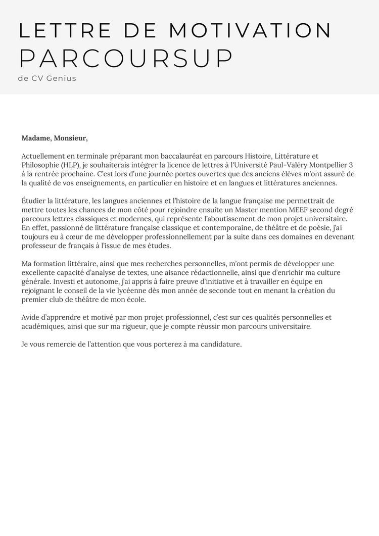 Je vous remercie de l’attention que vous porterez à ma candidature et j’ai hâte d’être accepté en première année de licence de lettres à l’Université Paul-Valéry Montpellier 3.