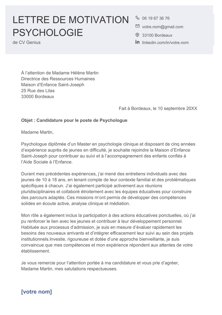 Exemple de lettre de motivation en psychologie avec expérience