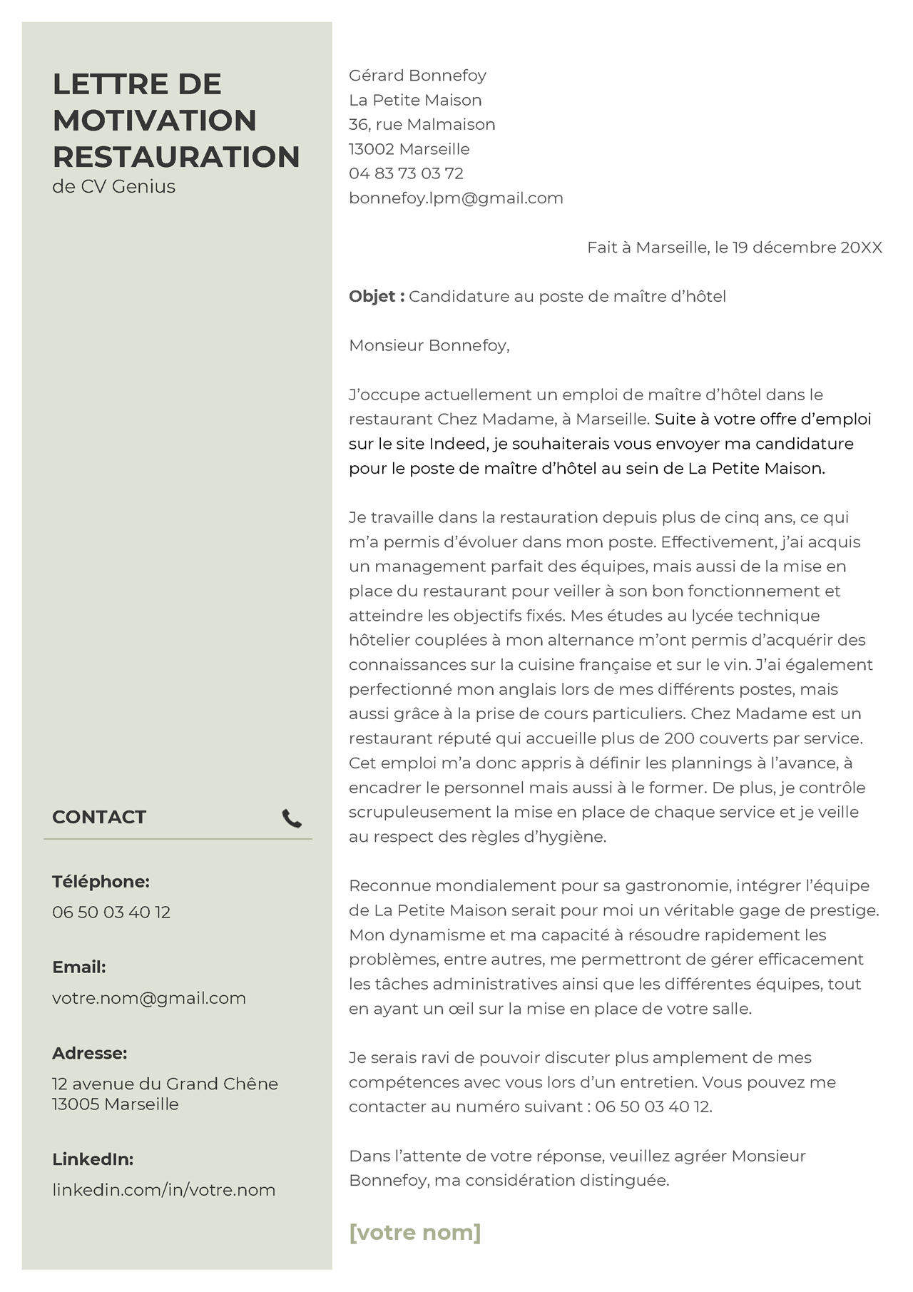 Mettez en avant les compétences qui sont essentielles dans le secteur de la restauration qui vous intéresse. En effet, pensez à personnaliser votre lettre de motivation restauration à chaque poste visé.