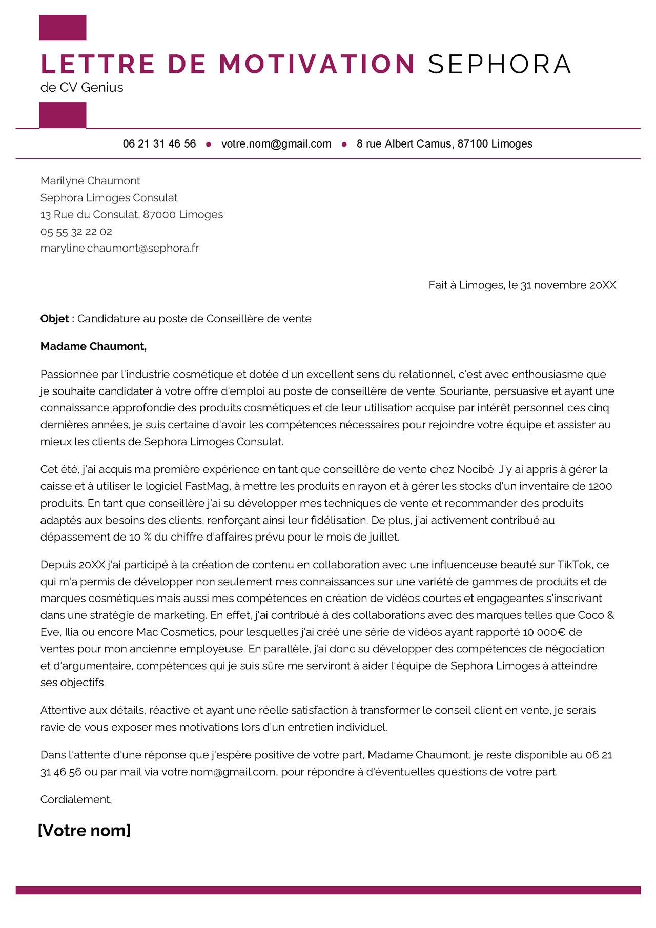 Enfin, n’oubliez pas d’adapter votre lettre en fonction des valeurs et de la mission de Sephora en tant que marque ayant son identité très distincte dans le milieu de la beauté et de la cosmétique parfumerie.