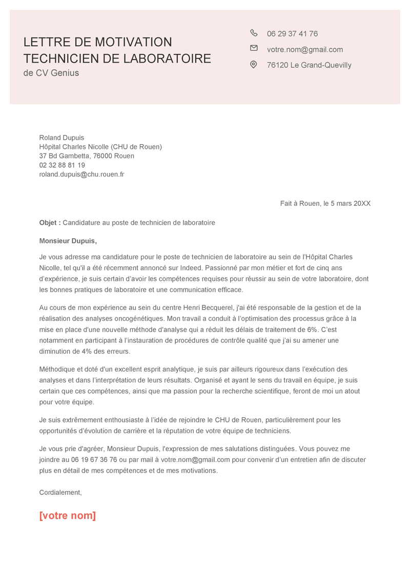 Lettre de motivation technicien de laboratoire (format texte)
